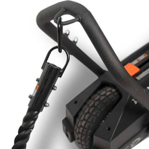 The TANK Tow Rope converts your TANK into a continuous rope machine and a towing apparatus. The Dacron rope, with its heat-sealed ends, is equipped with a robust metal bracket and carabiner, facilitating swift attachment to any tow hook on the TANK. For an enhanced experience, a second tow rope enables you and a mate to pull the TANK to and fro, ensuring a more effective exercise session.