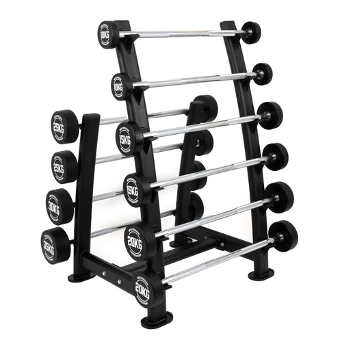 The rack features a robust black powder coat finish, ensuring durability and resistance to wear and tear, while the rubber feet provide stability and floor protection. Available with the option of purchasing the rack alone or bundled with 10 barbells.