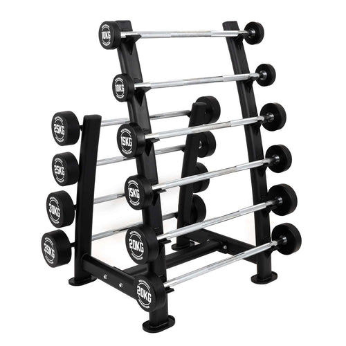 Featuring a timeless black and white design with a chrome-finished solid steel bar, they provide a sleek, professional look and feel. The medium knurling ensures a secure grip for safer, more effective workouts. While these barbells are built for heavy use, they are not intended to be dropped or used with power racks. For convenience, a Storage Rack is available for tidy and accessible storage. Elevate your fitness space with the Wolverson PU Fixed Weight Barbells, where functionality meets durability.